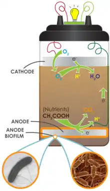 Окислення органічної речовини до СО2 бактеріями в анаеробній зоні осаду створює надлишок реактивних електронів на дні колонки. Деякі з цих електронів залишаються на дні, а інші використовуються бактеріями для відновлення Fe3+ до Fe2+. Відновлене залізо може бути знову окислене до Fe3+ у верхній аеробній зоні колонки. Наявність кисню на поверхні колонки спричинює дефіцит електронів. Різниця між концентраціями електронів на поверхні та на дні колонки створює електричний потенціал (напругу). Електричний потенціал можна виміряти за допомогою електродів, занурених на дно колонки (анод) та на поверхню осаду (катод). Напруга, що генерується, може змінюватись з часом. Наприклад, колонка Виноградського об’ємом 20 л може генерувати 0,3–0,5 В постійної напруги упродовж трьох років без додавання поживних речовин для мікроорганізмів.
