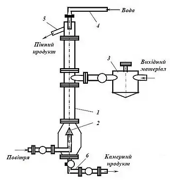 1 — колона; 2 — аератор; 3 — контактний чан; 4 — водний трубопровід; 5 — концентратний трубопровід; 6 — трубопровід відходів.