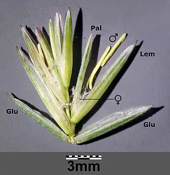 Луски Elymus repens: Glu — колоскові луски, Lem — нижні квіткові лусочки, Pal — верхні квіткові лусочки[1]