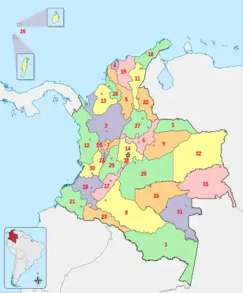 Колумбія — унітарна республіка, що поділяється на 32 департаменти (ісп. departamentos) і Столичний округ (Distrito Capital).