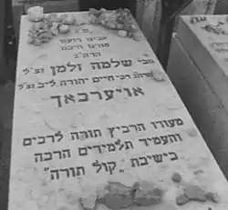 Надгробок рабина Ойербаха. Єдине вказане почесне звання — викладач у ієшиві «Коль Тора».