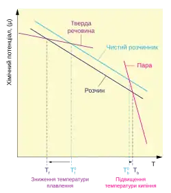 Щоб кількісно оцінити збільшення температури кипіння і зменшення температури плавлення розчину, слід знайти температуру при якій, за сталого тиску (1 атм.), пара чистого розчинника або чистий розчинник у твердій формі відповідно має такий же хімічний потенціал, як і розчинник у розчині (див. схему праворуч). Знайдені температури і будуть новими температурами фазового переходу[6].