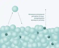 З молекулярної точки зниження тиску насиченої пари розчинника над розчином із збільшенням концентрації розчиненої речовини можна пояснити тим, що наявність молекул розчиненої речовини на поверхні розчину перешкоджає виходу молекул розчинника у пару але не перешкоджає їх поверненню[5].