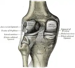 ![]() Лівий колінний суглоб ззаду, показані внутрішні зв'язки. | |