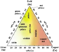 В залежності від співвідношення та характеру домішок в сплаві, визначається колір золота. Наприклад: