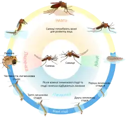 Самиця комара відкладає 30-150, і навіть 280 яєць (у малярійних комарів) кожні 2-3 дні. Яйце розвивається у дорослого комара протягом тижня. Для продукування яєць комарам потрібна кров, тому цикл відкладання яєць перебуває в прямій залежності від споживання крові.