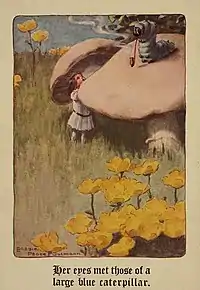 - Одним із персонажів відомої в усьому світі казки англійського математика, поета та письменника Льюїса Керролла Аліса в Країні чудес є велика блакитна Гусениця (англ. The Caterpillar), яка сидить на великому грибові та попихкує великою люлькою. Гусениця вважає, що її зріст у 3 дюйми — чудовий розмір. Алісі Гусениця не подобається і навіть дратує її, оскільки та не звертає на неї уваги і ставить дивні запитання. Потім Гусениця пояснює Алісі, як зменшити чи збільшити свій розмір[14]. Українською мовою казку перекладали Г. Бушина та В. Корнієнко.