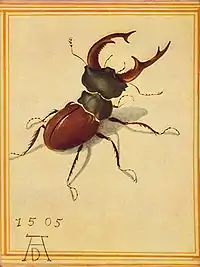 Для багатьох людей із комахами пов'язані вкрай неприємні асоціації та ситуації: таргани в квартирах, надокучливі комарі та мухи, оси тощо. Утім, деякі представники комах мають естетично привабливий вигляд, що не могло не надихнути майстрів пензля на написання картин. На своїх полотнах комах відтворювали відомі художники різних епох, а саме: Балтазар ван дер Аст, Георг Флегель, Сальвадор Далі, Василь Полєнов та ін. Причому комахи були предметом зображення або в цілому, або як елемент (художня деталь) картини. Серед комах завдяки своєму найрізноманітнішому забарвленню особливу увагу художників привертали метелики, зображення яких знаходять ще на давньоєгипетських фресках[3]. Так, у німецького художника Вільгельма фон Каульбаха є картина «Метелики» (нім. Schmetterlinge, приблизно 1860 рік), іншому відомому німецькому художнику, Карлу Шпіцвеґу, належить картина «Мисливець на метеликів» (нім. Der Schmetterlingsjäger, 1840 рік). На картинах, зокрема, зображували жука-оленя. Наприклад, видатний німецький художник Альбрехт Дюрер 1505 року аквареллю написав картину «Жук-олень». Німецький художник Георг Флегель є автором натюрморту, де серед їжі та столового прибору також намальовано цього жука.