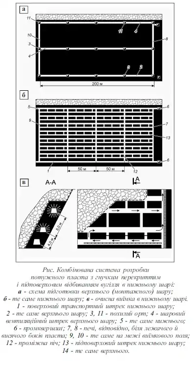 - СИСТЕМА РОЗРОБКИ РОДОВИЩА КОМБІНОВАНА З ГНУЧКИМ ПЕРЕКРИТТЯМ — суть систем цієї групи в тому, що потужний пласт поділяють на два похилих шари не однакової товщини. Верхній шар (монтажний) товщиною 1,3…1,8 м відробляється першими довгими стовпами за простяганням. По міру виймання вугілля на підошві шару монтують гнучке перекриття із металевих смуг та сіток. Нижній шар можна виймати різними системами розробки. Частіше використовують, як показано на рисунку, систему підповерхових штреків. Кожен підповерх похилою висотою до 12…15 м оконтурюють двома підповерховими штреками (транспортним та вентиляційним), проведеними біля підошви пласта, та двома горизонтальними хідниками з боку перекриття. Підповерхові штреки з'єднують через декілька метрів печами, а підповерхові штреки та хідники на транспортному і вентиляційному горизонтах збивають ортами. Вугілля на підповерсі виймають буропідривним способом в напрямку від межі поля до проміжного квершлаґу під захистом гнучкого перекриття, яке поступово опускається. Головна перевага системи — можливість розробки родовищ зі складними гірничогеологічними умовами. Недоліки — велика трудомісткість робіт, значні втрати вугілля (понад 30%), висока пожежонебезпека. Система застосовується для розробки пластів потужністю 6…12 м з кутами падіння понад 40о зі складним заляганням, але породи покрівлі повинні бути не нижче середньої стійкості, бо при слабших утруднюється монтаж гнучкого перекриття.