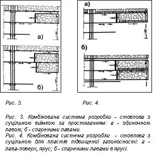 - У в у г і л ь н і й п р о м и с л о в о с т і найчастіше зустрічаються комбінації суцільних та стовпових систем розробки. Необхідно розрізняти комбінації суцільних зі стовповими і стовпових з суцільними. Критерієм віднесення до того чи іншого типу систем служить ознака розташування і підтримання транспортної виробки. Якщо вона проводиться одночасно з очисними роботами і зазнає їх впливу (ознаки суцільної системи), а вентиляційна проведена завчасно, підтримується в масиві вугілля чи в зоні сталого гірничого тиску (ознаки стовпової системи), то це комбінація суцільної системи зі стовповою. І, навпаки, коли транспортна виробка має ознаки стовпової системи, а вентиляційна суцільної, то це комбінація стовпової системи з суцільною. Основна мета комбінації суцільної системи розробки зі стовповою полягає в зменшенні обсягу проведення виїмкових виробок за рахунок їх повторного використання. Переваги: прямоточне провітрювання дільниці, унеможливлення витоку повітря через вироблений простір, а також стабільність депресії, оскільки довжина шляху руху повітря залишається незмінною (рис. 1). До комбінованих систем розробки належить і система парних штреків (рис. 2), суть якої полягає в тому, що непарні яруси панелі відпрацьовують суцільною системою розробки, а парні — стовповою. У перший період виїмку ведуть в 1-му і 3-му ярусах за суцільною системою (а), завдяки чому при підході до межі панелі в 2-му ярусі оконтурюється довгий стовп за простяганням. На межі панелі проводять розрізну піч і відробляють стовп до бремсбергу чи похилу за стовповою системою. Одночасно відробляють 5-й ярус суцільною системою і підтримують транспортний штрек відробленого 3-го яруса, а також проводять транспортний штрек 6-го яруса. У третій період відробляють за стовповою системою 4-й та 6-й яруси (в). Таким чином, в кожний період в панелі відробляють чотири лави. Переваги комбінованої системи розробки парними штреками: швидке введення в дію очисних вибоїв, зниження обсягу проведення виїмкових виробок, зменшення втрат вугілля за рахунок повної відсутності міжлавних ціликів та ін. Недоліки: висока трудомісткість робіт по підтриманню штреків, при зворотній виїмці, штреки на сполученні з лавами зазнають значного гірничого тиску, що підвищує імовірність обвалення порід. Умови застосування парних штреків: пласти потужністю до 1,2-1,3 м з боковими породами не нижче середньої стійкості. Комбіновані системи розробки стовпових з суцільними дозволяють: — забезпечити добрий стан транспортних виробок у масиві вугілля (рис. 3); — зменшити первинний обсяг проведення виробок при підготовці виїмкової дільниці; — поліпшити умови провітрювання дільниці і збільшити навантаження на очисний вибій за газовим фактором, що досягається прямоточним рухом повітря з направленням вихідного струменя на вироблений простір і її підсвіжуванням додатковим повітрям (рис. 4). При значному газовиділенні на дільниці, особливо з виробленого простору, такими системами вдається більш ніж в 2-2,5 рази підвищити навантаження на лаву порівняно зі стовповою системою розробки. На шахтах США і Канади широко розповсюджена комбінована камерно-стовпова система розробки, а при розробці потужних пластів у Кузбасі знаходить застосування комбінована система розробки з гнучким перекриттям.