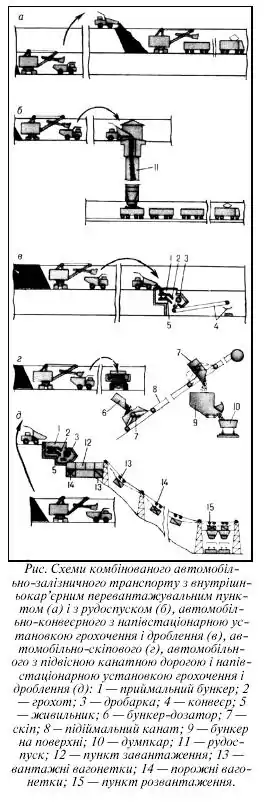 - 5) Крім осн. видів комбінованого кар'єрного транспорту, відомі комбінації автомоб. транспорту з гравітаційним, канатним, гідро- і пневмотранспортом та інш. Вони практично не поширені.