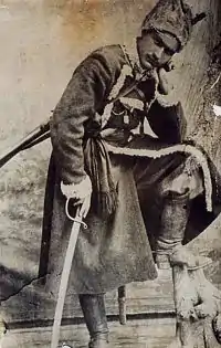 Був одягнутий, аж страшно дивитись: шапка сива, шлик — червоний, чемерка — чорна, обкладена сивим, пояс — червоний, штани — червоні, як козацькі, широкі, чоботи — лаковані. А пояс зав'язаний по-козацьки.