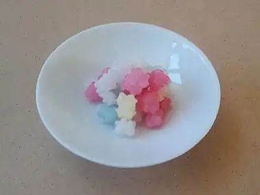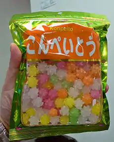 - Richard Hosking A Dictionary of Japanese Food 1996 Page 84 « Konpeitō コンペイトー 金平糖 comfit. A sugar candy introduced by the Portuguese in the sixteenth century, one kind of higashi. It is a small toffee sphere (5 mm in diameter) with a pimply surface, made from sugar, water, and flour in a variety of colours. Originally there was a sesame seed in the middle, later a poppy seed, but nowadays no seed at all. The word comfit derives from the Portuguese confeito.»