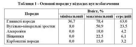 Літологічний склад відходів вуглезбагачення свідчить, що в них превалюють глинисті породи і високозольні вугільно-мінеральні зростки. Алевроліти, пісковики і карбонатні породи містяться у відходах збагачення в незначних кількостях. Глинисті породи представлені в основному аргілітом і вуглистим аргілітом. Вміст основних типів порід у відходах вуглезбагачення наведено в таблиці 1.