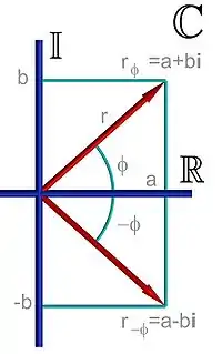 - Кут такий, що: і , називається аргументом і позначається . Для комплексного нуля значення аргумента не визначене, для ненульового числа аргумент визначається з точністю до , де — будь-яке ціле число. Головним значенням аргумента (позначається [5]) називається таке значення, що .