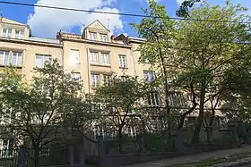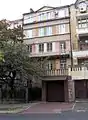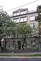 - Будинок № 9: фасад вужчий, ніж у будинку № 7, асиметричний (вхідний портал розташований по лівій осі фасаду), завершується карнизом із дентикулами та мансардою, увінчаною значно вужчим, ніж у будинку № 7, трикутним фронтоном. Вікна прямокутні, значно вужчі, ніж у сусідніх будинках. Центральну вісь фасаду підкреслює ряд вікон у рустованих рамках, вікна третього і четвертого поверхів мають підвіконні тафлі із орнаментом у вигляді давньогрецьких ваз, виконаним у техніці сграфіто у стилі ар-деко. Вхідні двері мають великий прямокутний світлик, прикрашені решіткою з геометричними мотивами (аналогічні до дверей будинку № 7).