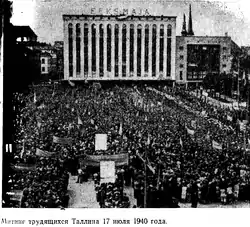 28 вересня 1939 Естонія уклала з СРСР вимушену угоду про взаємну допомогу, відповідно до якої на території Естонії були розміщені військові бази Радянського Союзу. 16 червня 1940 року радянський уряд висунув ультиматум щодо зміни естонського уряду та про введення додаткового контингенту військ. Ультиматум було прийнято, й 17 червня були введені додаткові війська. Це означало окупацію всієї території країни[16]. 21 червня 1940 року було сформовано Народний уряд Естонії, що складався, в основному, з лівих соціалістів чи тих, хто їм співчував. До складу уряду увійшли: голова Йоганнес Барбарус, міністр закордонних справ Ніголь Андрезен, міністр внутрішніх справ Максим Унт, міністр землеробства Олександр Іоер, міністр юстиції Борис Сепп та інші[17]. 5 липня президент Пятс ухвалив рішення про проведення позачергових виборів до Рійгікогу. Того ж дня рішенням начальника внутрішньої оборони, заступника міністра внутрішніх справ Гаральда Габермана було знято заборону на діяльність КПЕ та вийшов 1-й номер легальної газети компартії «Kommunist»[18].