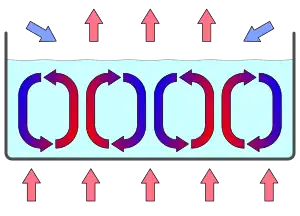 У тонкому шарі при підігріві знизу утворюються комірки правильної гексагональної форми, усередині яких рідина підіймається в центрі й опускається гранями комірки[2]. Така постановка експерименту історично була першою, однак тут насправді спостерігається конвекція Марангоні, що виникає за рахунок дії сил поверхневого натягу і залежності їх від температури рідини.