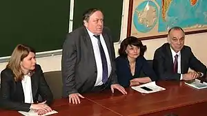 ![]() Всесвітній день води — круглий стіл у КНУ ім. Т. Шевченка. Зліва: в.о. міністра екології та природних ресурсів України Г. О. Вронська, президент УГТ Я. Б. Олійник, в.о. голови Держводагентства України І. І. Овчаренко, голова комісії з гідрології та гідроекології УГТ В. К. Хільчевський, 22.03.2016 | |
