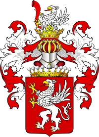 У червоному полі срібний гриф у золотому озброєнні та червоним язиком. Над щитом графська корона, а над нею шолом в короні, з якого клейнод: пів-грифа, як і в гербі з червоним рогом кчнцем до низу. Намет червоний, підбитий сріблом.