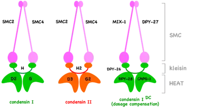У багатьох евкаріотичних клітинах комплекси конденсину представлені двома типами: конденсин I та конденсин II, кожен з яких складається з п'яти субодиниць.[3][4] Конденсини I та II мають однакову пару ключових субодиниць, SMC2 та SMC4, що належать до великої групи хромосомних АТФаз, відомих як SMC-білки (SMC від Structural Maintenance of Chromosomes). Кожен з комплексів конденсину також містить набір не-SMC-регуляторних субодиниць (клейзин[5] а також пару HEAT-повтор субодиниць[уточнити][6]). Нематода Caenorhabditis elegans має також третій тип комплексу (схожий на конденсин I) який бере участь у регуляції експресії генів, на рівні хромосом, тобто у дозовій компенсації.[7] В цьому комплексі, відомому як конденсин IDC, аутентична субодиниця SMC4 замінена на її варіант DPY-27.