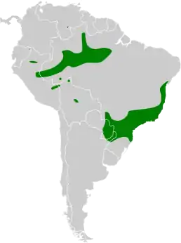 Оливкові конопи мешкають в Бразилії, Венесуелі, Еквадорі, Перу, Болівії, Аргентині і Парагваї. Вони живуть у вологих рівнинних тропічних лісах і в заболочених лісах, на узліссях і галявинах. Зустрічаються на висоті до 950 м над рівнем моря.