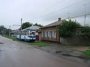 Трамвай № 2 на вул. Сарнавській серед старовинної приватної забудови