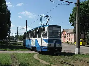 Трамвай № 1 на розі просп. Червоної Калини і вул. Успенсько-Троїцької
