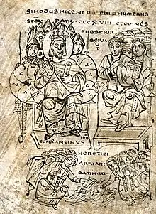 В червні 325 року в місті Нікея за розпорядженням Константина було скликано собор, який став відомий як перший Вселенський. Почесним головою на соборі був імператор, який тоді не був ні хрещеним, ні оприлюдненим і належав до розряду «слухачів».
