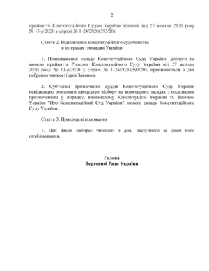 Верховна Рада України від імені Українського народу<…> беручи до уваги зухвале та безпрецедентне порушення Конституційним Судом України основних засад своєї діяльності під час розгляду справи № 1-24/2020(393/20) та спробу повалення конституційного ладу і захоплення державної влади в Україні<…> приймає цей Закон.[2]