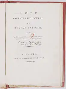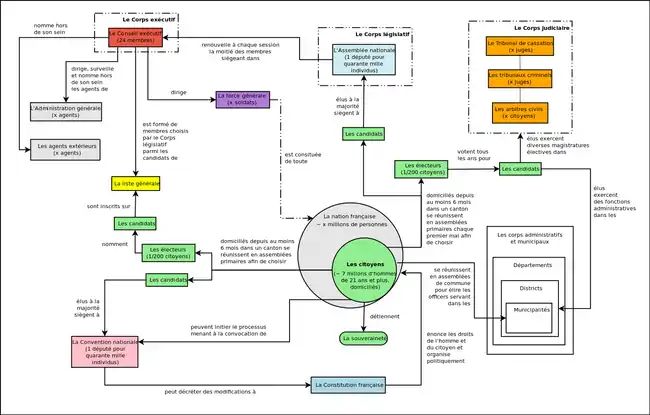 Соціального ладу, встановленого конституцією 1791 року, якобінська конституція жодним чином не змінювала. Лише в політичному відношенні вона відрізняється більшим демократизмом: вибори стали прямими, ценз скасовано, вік виборців з 25 років знижено до 21 року. Законодавчі збори передбачалося обирати на рік, з правом видавати декрети і пропонувати закони: якщо протягом 40 днів з часу їхнього оприлюднення одна десята частина первинних зборів від половини загального числа департаментів плюс один не опротестує прийнятого законодавчими зборами проекту закону, то останній стає законом; в іншому випадку збираються первинні збори, на яких народ може тільки вотувати «так» чи «ні».