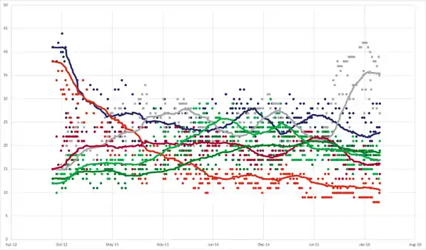 | 4—7 березня 2016 | I&O Research[16] | 2 510 | 33 % | 44 % | 24 % | 11 % |