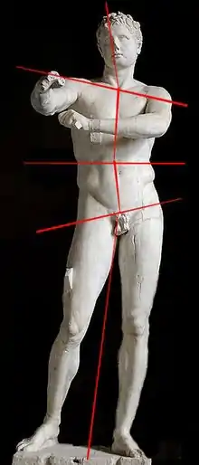 - Вага фігури зосереджена на одній нозі, в той час як інша вільна, хоча і не відділяється від підніжжя