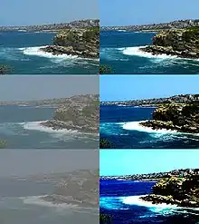 - Кольоровий контраст — різновид оптичного контрасту, пов'язаний з різницею кольорових відтінків. Поняття використовується в дизайні, рекламі та в фотографії («за рахунок кольорової контрасту виділений об'єкт …»).