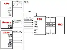 Одна плата контролера дисководів гнучких дисків комп'ютера IBM PC підтримує під'єднання до чотирьох дисководів. Плата контролера вставляється у роз'єм ISA, таким чином з'єднуючись зі системною шиною комп'ютера і з деякими лініями керування (такими, як сигнали керування прямим доступом до пам'яті, або входом контролера переривань — у IBM PC це переривання IRQ 6).