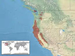 Мешкає у штатах США: Каліфорнія, Вашингтон, Орегон, у провінції Канади: Британська Колумбія.