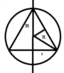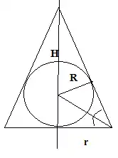 - Радіус кулі R, радіус основи конуса r і висота конуса H пов'язані співвідношенням: