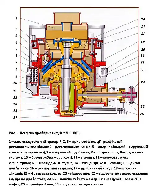 Верхня частина дробарки обладнана завантажувальним пристроєм 1 для рівномірного розподілу руди за допомогою тарілки 16. Зменшення крупності матеріалу здійснюється роздавлюванням у результаті коливального руху дробильного конуса 17 напресованого на головний вал. Маса вала, а також вертикальна і горизонтальна складові зусиль дроблення сприймаються сферичним підп'ятником-опирачем 7. Нижня поверхня конуса 17 має форму сфери з тонкою бронзовою прокладкою. Опорна чаша 8, яка служить опорою для сферичної поверхні, насаджена на стінку картера, що складає одне ціле зі станиною 11. Для запобігання проникнення пилу і дрібних частинок матеріалу у сферичний підп'ятник 7 передбачений гідравлічний затвор 20.