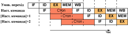 Ця ситуація зображена на малюнку. Для такого конвеєра виконання переходу означає зупинку конвеєра на три такти, щоби вивантажити непотрібні тепер команди і завантажити необхідні з іншої гілки програми. Очевидно, що чим більше стадій в конвеєрі, і чим віддаленіша від початку стадія обчислення адреси переходу, тим значнішими будуть втрати швидкодії.