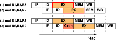 В конвеєр послідовно завантажені дві команди множення, які не мають конфліктів даних, але суміщення виконання цих команд на стадії безпосереднього множення є неможливим, адже не може бути забезпечено розділення між ними пристрою множення. Тому для другої з команд конвеєр зупиняється на один машинний цикл.