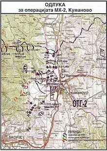 Того ж дня рада безпеки Македонії прийняла рішення про початок нового наступу проти АНВ, щоб вигнати їх зі своїх опорних пунктів у селах на північ від Куманово[51]. Жителям сіл, підконтрольних АНВ, дали можливість евакуюватися до 15:00, початку наступу сил безпеки Македонії. Офіційний представник армії Георге Трендафілов повідомив Ассошіейтед Прес, що АНВ утримує як живий щит тисячі жителів села[50]. Наступ почався з обстрілу обраних цілей у Ваксінце військовими гелікоптерами та польовою артилерією.