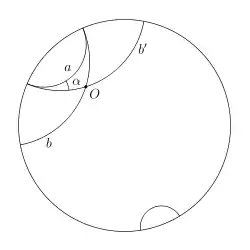 За площину Лобачевського приймається внутрішність круга (див. мал.) в евклідовому просторі; межа даного круга (коло) називається «абсолютом». Роль геодезичних ліній виконують дуги кіл , перпендикулярних до абсолюту, і його діаметри[3]; роль рухів — перетворення, одержувані комбінаціями інверсій відносно кіл, дуги яких служать прямими.