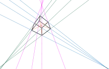 Конфігурацію Рейє можна реалізувати у вигляді точок і прямих на евклідовій площині, якщо намалювати тривимірну конфігурацію в 3-точковій перспективі. Конфігурацію 83122 восьми точок на дійсній проєктивній площині і 12 прямих, що з'єднують їх зі схемою з'єднань куба, можна розширити до конфігурації Реє тоді й лише тоді, коли вісім точок є перспективною проєкцією паралелепіпеда.[3]