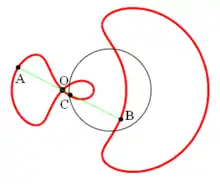 Дві гілки конхоїди кола із спільним центром O. Для будь-якого розташування точки С на колі відтинки AC і BC мають бути рівними і лежати на прямій, що проходить через точки O та C.