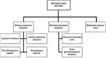 - Збройні Сили України «передбачають три види військ: Сухопутні війська (Війська наземної оборони), Військово-повітряні сили і Сили протиповітряної оборони (Війська повітряної оборони), Військово-морські сили. До Військ наземної оборони також належать Прикордонні війська, Республіканська гвардія і війська цивільної оборони». Наведений склад Збройних Сил України дає підстави зробити висновок, що вони є сукупністю окремих державних структур або окремих озброєних (воєнних) організацій, які, застосовуючи наявні власні сили і засоби, здатні забезпечити в цілому захист держави від можливої агресії (наприклад, Сухопутні війська, Військово-повітряні сили, Сили протиповітряної оборони, Військово-морські сили, Прикордонні війська, війська цивільної оборони) та ліквідацію загроз, що можуть виникати всередині держави (наприклад, Республіканська гвардія).