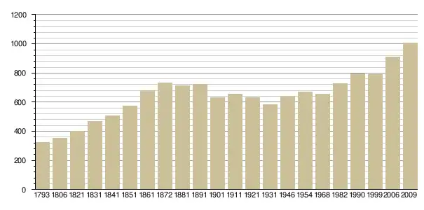 Динаміка населення (base Cassini de l'EHESS pour les nombres retenus jusque 1962[3], base Insee à partir de 1968 (population sans doubles comptes puis population municipale à partir de 2006)[4] · [5] ):