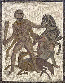 ![]() Геракл приборкує коней Діомеда. Римська мозаїка III століття |