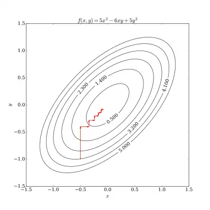 Координатний спуск заснований на ідеї, що мінімізація багатоваріантної функції може бути досягнута шляхом мінімізації її по одному напрямку за один раз, тобто, вирішення одноманітної (або, принаймні, набагато простішої) проблеми оптимізації в циклі.[1] У найпростішому випадку циклічного координатного спуску, він циклічно повторюється через напрямки, по одному, мінімізуючи цільову функцію щодо кожного напрямку координат одночасно. Тобто, починаючи з початкових значень змінних