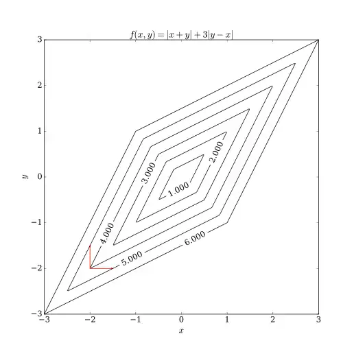 Координатний спуск має дві проблеми. Одна з них — це відсутність гладкої функції багатьох змінних. На наступному малюнку видно, що ітеративний спуск координатами може застрягнути в нестаціонарній точці, якщо криві рівня функції не є гладкими. Припустимо, що алгоритм знаходиться в точці (-2, -2); Тоді є два напрями, орієнтовані на осі, які можна розглянути для кроку, позначені червоними стрілками. Однак кожен крок уздовж цих двох напрямків збільшуватиме значення цільової функції (припускаючи проблему мінімізації), тому алгоритм не зробить жодного кроку, навіть якщо обидва кроки разом наблизили б алгоритм до оптимального. Хоча цей приклад показує, що спуск координатами не обов'язково збігається з оптимальним, можливо виявити формальне зближення при розумних умовах.[2]