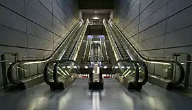 Вхідні та вихідні пасажирські потоки грамотно розведені і не перетинаються. Два ескалатори ведуть на проміжний поверх, інша пара далі на платформу (на станціях мілкого закладення проміжного поверху немає). Мається ліфт, який доставляє пасажирів з рівня землі на платформу і назад. На підземних станціях доступ в тунель з платформи неможливий, так як вона має стінки з прозорого матеріалу, в які вмонтовані розсувні двері. Відкриття та закриття дверей поїзда і платформи синхронізовано (за принципом підйомника) і контролюється автоматичною системою безпеки. Дана система використовується в цілях безпеки, (запобігає падінням або стрибкам пасажирів на рейки, підвищує безпеку для слабозорих пасажирів) і економічності (дешевше і краще контролювати вентиляцію на станціях і тунелях).[15] На станціях, розташованих у центрі міста, чергові метро-стюарди стежать за порядком і при необхідності надають допомогу пасажирам.